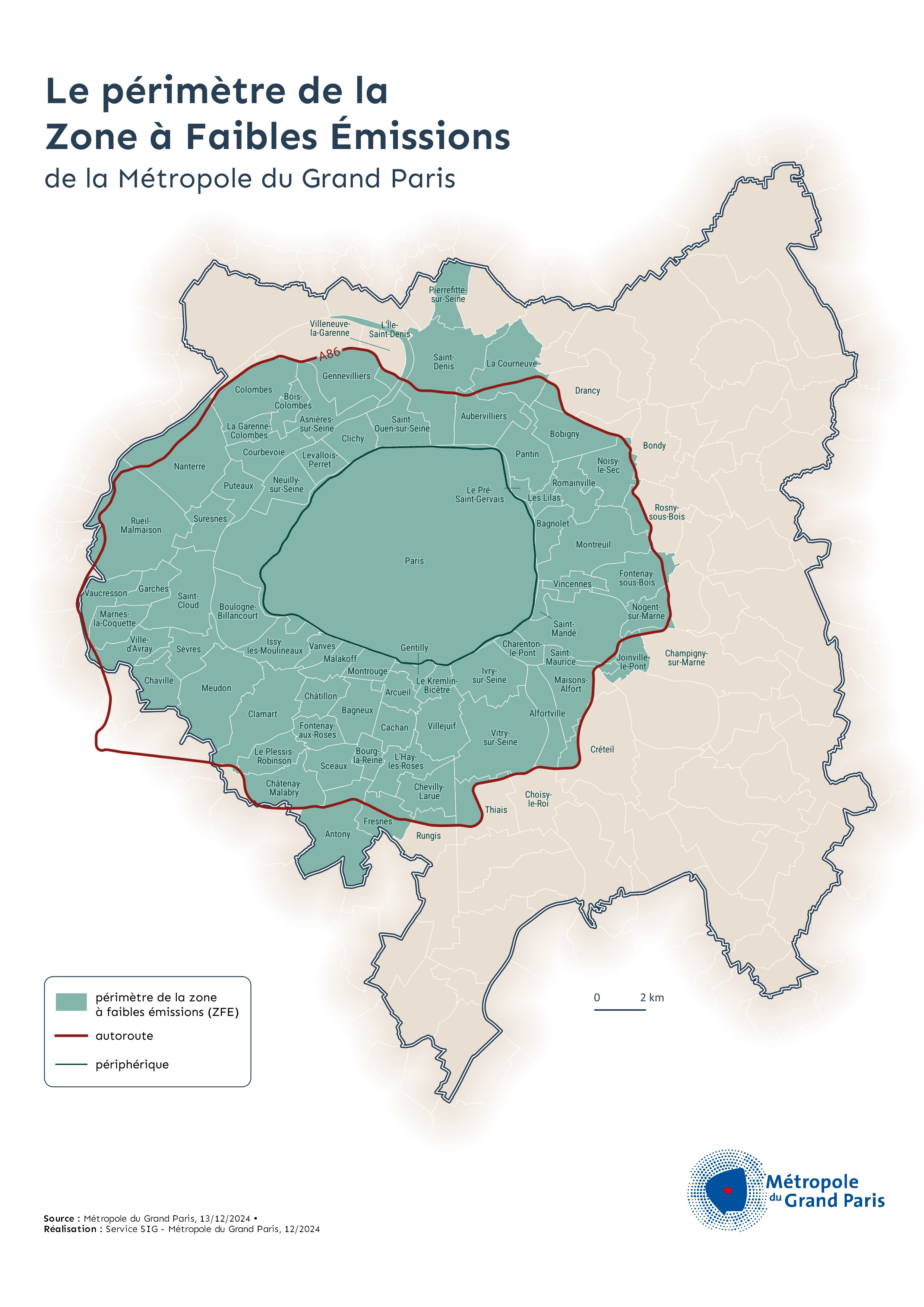 Description: La Zone à Faibles Émissions (ZFE) restreint la circulation des véhicules les plus polluants au sein d'un périmètre donné. Elle vise ainsi à accélérer le renouvellement du parc roulant, avec des étapes progressives.Le périmètre de la ZFE s’étend sur 77 communes de la Métropole du Grand Paris à compter du 1er janvier 2025.La ZFE s'applique tous les jours de la semaine, de 8 h à 20 h. Les véhicules légers (voitures particulières, 2 roues motorisés, véhicules utilitaires) concernés peuvent circuler le soir de 20h à 8h, les weekend et les jours fériés. Pour les poids lourds, cars et bus plus anciens, la restriction s’applique tous les jours de la semaine de 8h à 20h. Des dérogations nationales ou locales peuvent s’appliquer (véhicules de secours, etc.).Classification Crit'air des véhicules : Crit’Air 0 – 100% électrique et hydrogèneCrit’Air 1 – Véhicules gaz ou hybride rechargeables, véhicules essence depuis le 1er janvier 2011 pour les voitures, depuis le 1er janvier 2017 pour les motocycles et 1er janvier 2018 pour les cyclomoteurs.Crit’Air 2 – Véhicules essence et hybrides entre 2006 et 2010, véhicules diesel depuis le 1er janvier 2011 pour les voitures, entre 2007 et 2016 pour les motocycles et entre 2007 et 2017 pour les cyclomoteursCrit’Air 3 – Véhicules essence, hybride, entre 1997 et 2005, diesel entre 2006 et 2010, entre mi 2004 et 2006 pour les motocycles et les cyclomoteursCrit’Air 4 – Véhicules diesel, entre 2001 et 2005 pour les voitures, entre mi 2000 et 2004 pour les motocycles et les cyclomoteursCrit’Air 5 – Véhicules diesel, entre 1997 et 2000Non-classés – Avant 1997 pour les voitures et avant le 31 mai 2000 pour les motocycles et cyclomoteursPlus d'informations sur https://www.metropolegrandparis.fr/fr/la-zone-faibles-emissions-metropolitaineRéférence spatiale : RGF 1993 CC49 (EPSG 3949)Mise à jour non programmée à ce jour.Source : Métropole du Grand ParisConditions d’utilisation : Licence libre Etalab 2.0